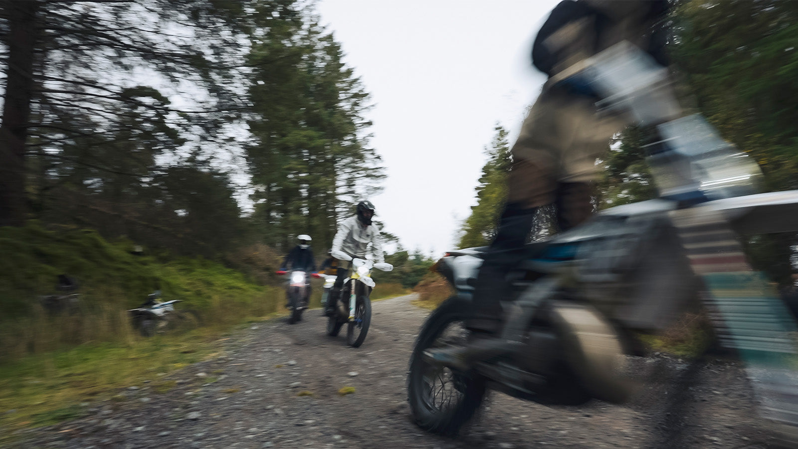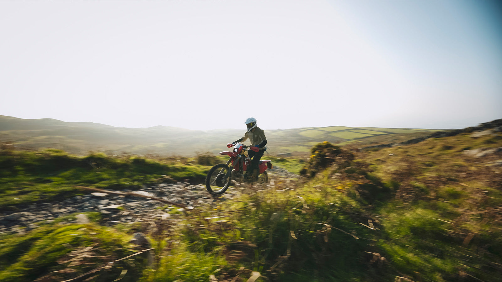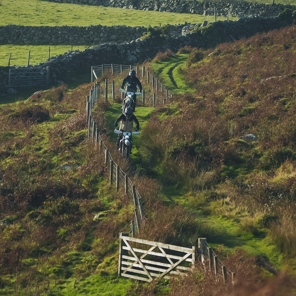 Sie bewältigen einige der schwierigsten Streckenabschnitte der Tour: steile, felsige Abfahrten, kurvige Anstiege und breite, geschwungene Feldwege, auf denen die Motorräder über die walisischen Hügel flitzen können. Scherze und Gelächter kommen fett und schnell. Es gibt kleine Siege und gelegentliche Stürze, aber alle sind hochmotiviert durch das Gefühl des Fortschritts und der gemeinsamen Leistung.