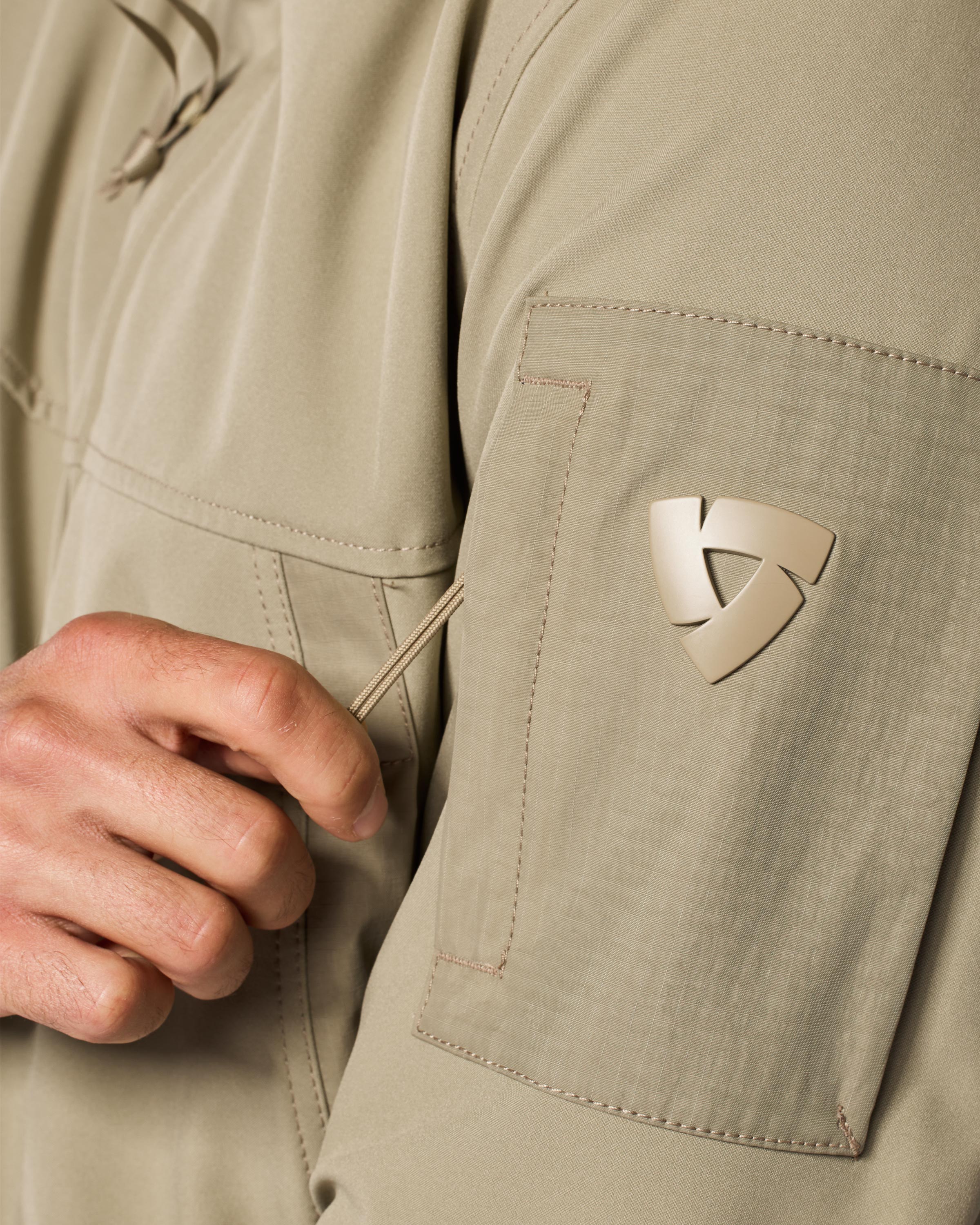 Leichtes Ripstop-Material aus strapazierfähigem Polyamid in Knitteroptik verleiht dem Design einen besonderen Charakter.