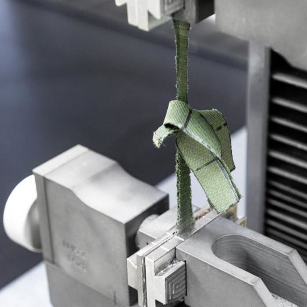 La résistance à la déchirure – Cette fois un échantillon pré-entaillé est « écartelé » et on mesure la force nécessaire pour le déchirer davantage. Si vous entaillez votre vêtement avec un objet tranchant, nous voulons être certains qu'il sera particulièrement difficile d'agrandir la partie fendue.