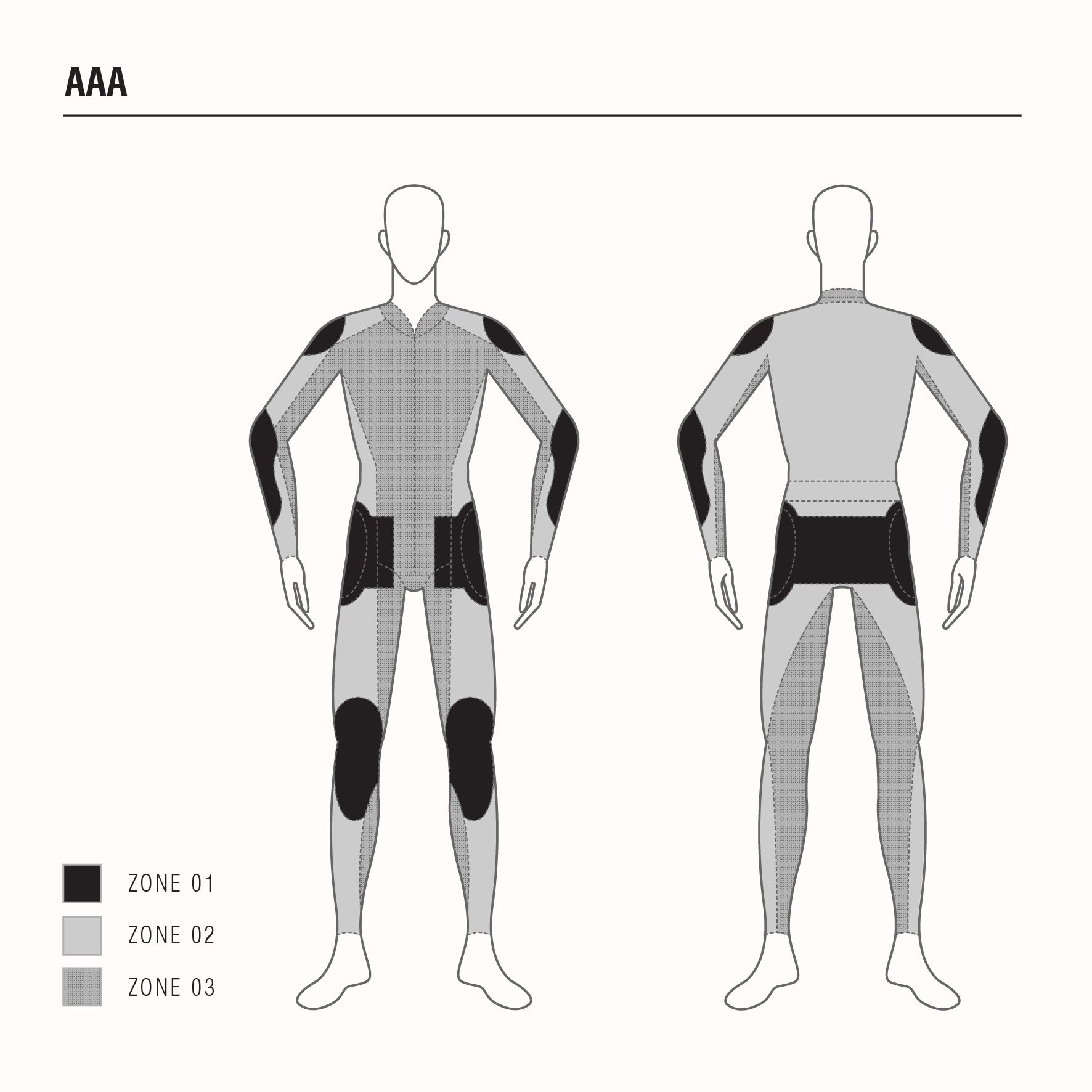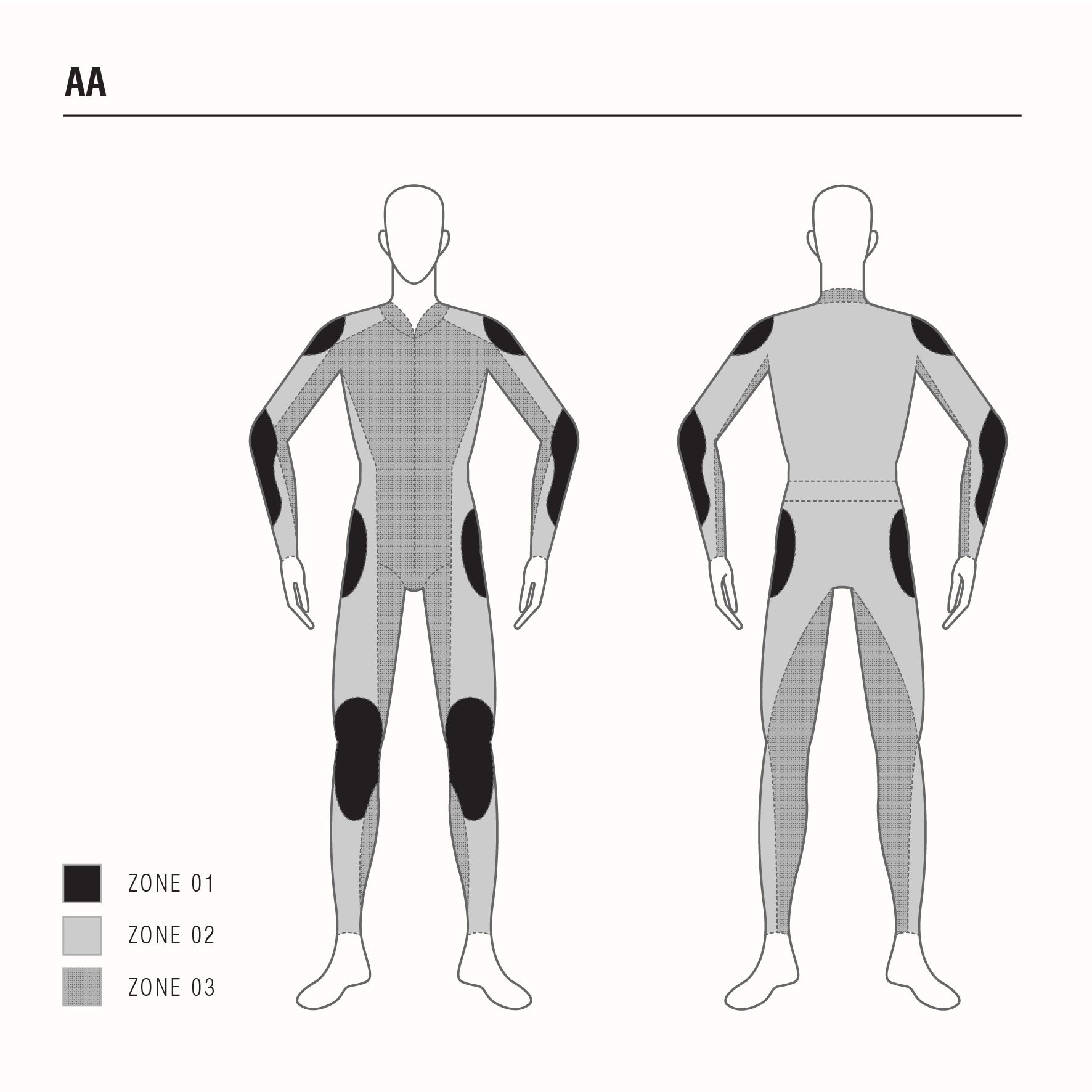 Les vêtements CU ne sont pas découpés en zones car ils offrent une protection antichoc uniquement au niveau des protections intégrées au vêtement.