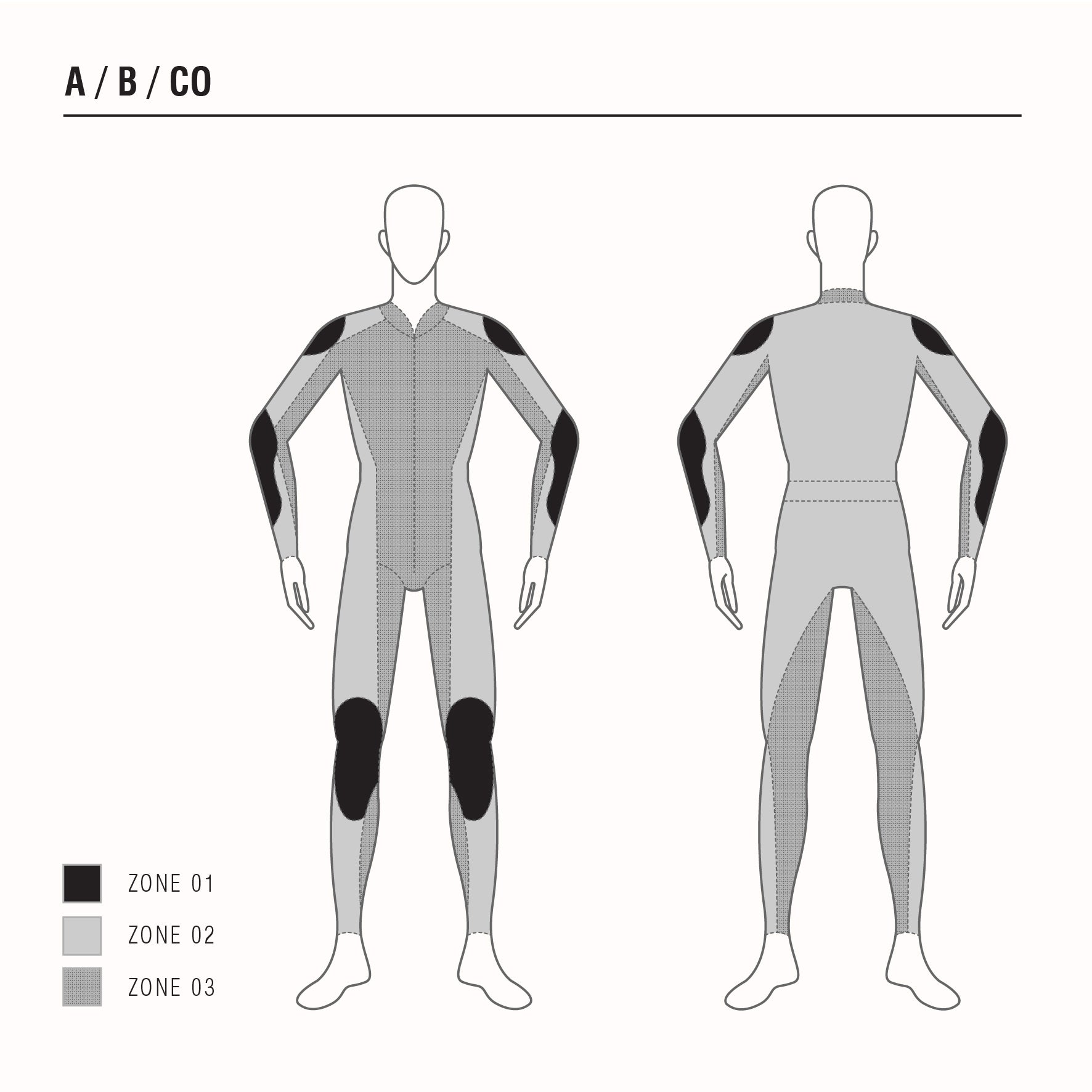 Le découpage en zones des vêtements de Catégories B et CO est le même que pour les vêtements de Catégorie A.