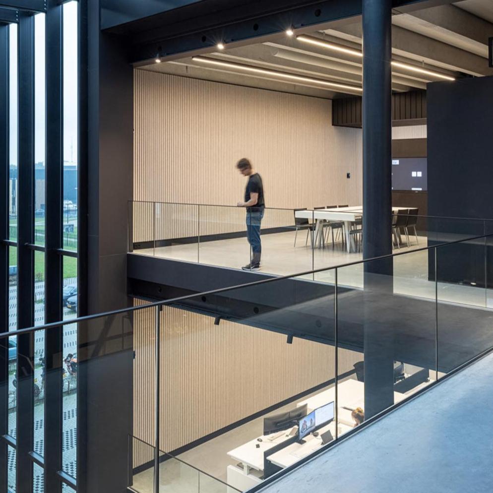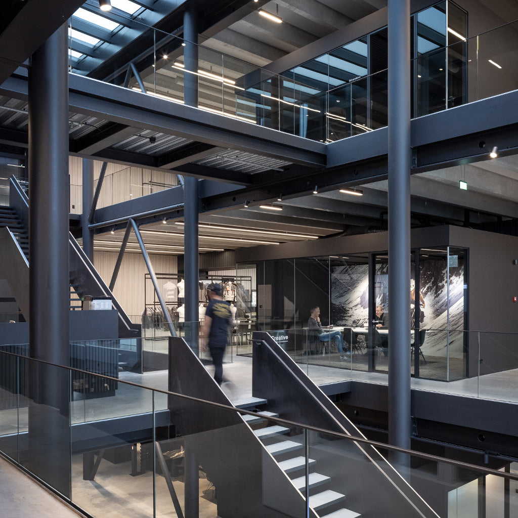 Des murs de verre imposants vous entourent, qui offrent ouverture et transparence et participent à la communication et la collaboration entre les personnes hétérogènes, intéressantes et réfléchies qui travaillent chez REV'IT!.