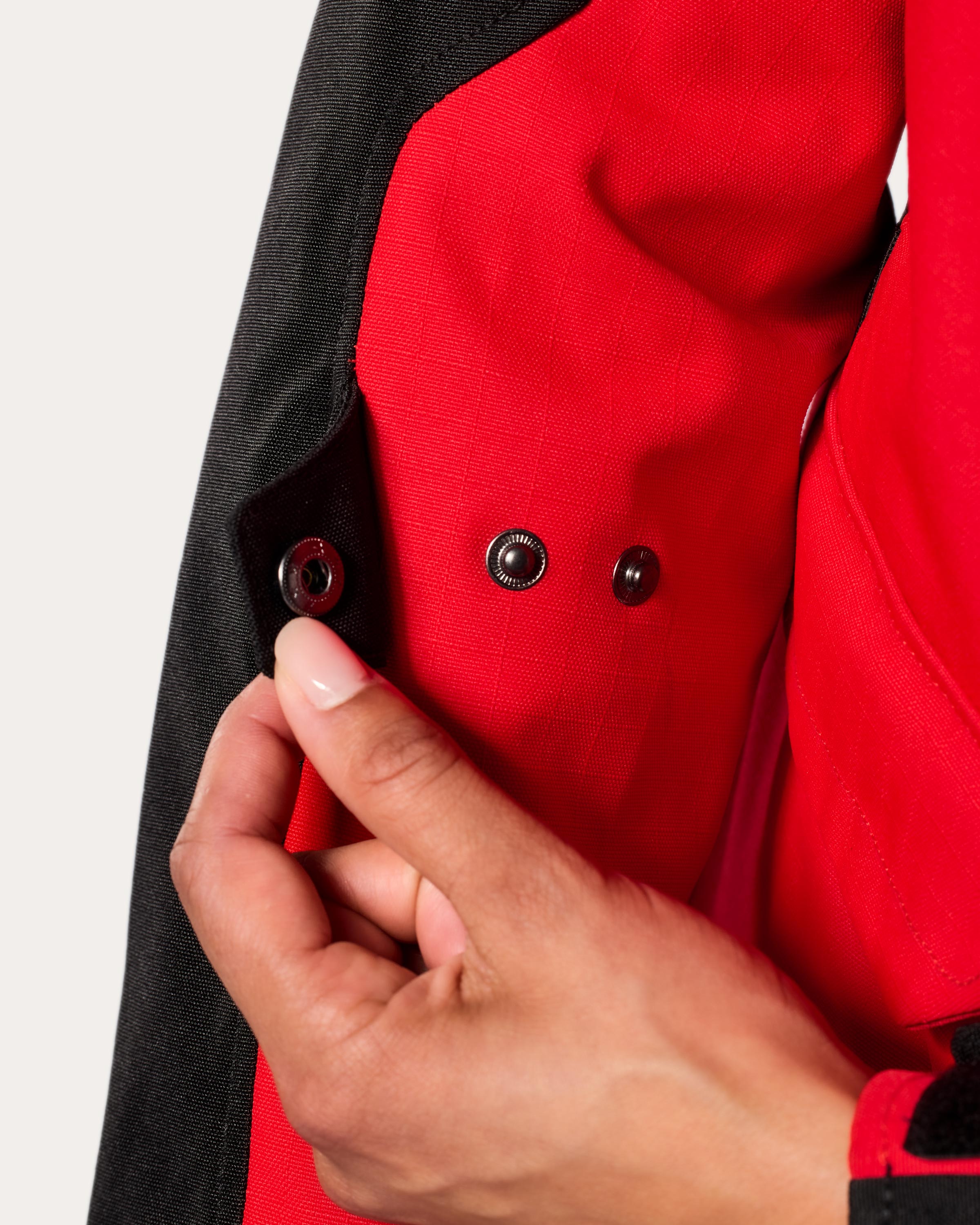 Le système de fermeture à bouton-pression bidirectionnel du col permet de fermer le col par mauvais temps et se retourne pour utiliser le même bouton-pression afin de maintenir le col ouvert et dégagé pour laisser entrer l'air frais.
