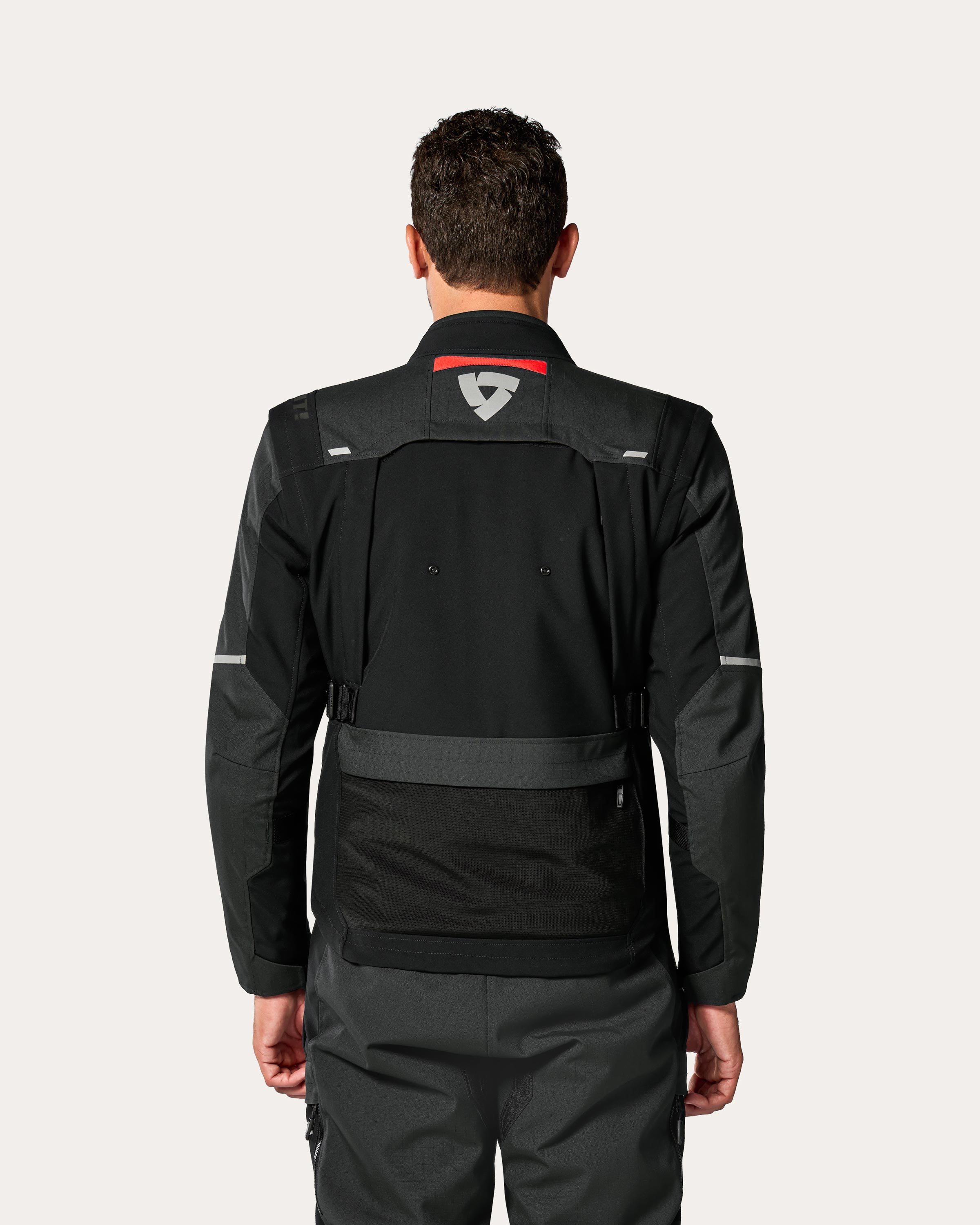 La poche arrière de ce blouson REV’IT! est conçue pour y insérer une protection dorsale SEESOFT CE-niveau 2 de type RV – un moyen simple de maximiser la sécurité.
