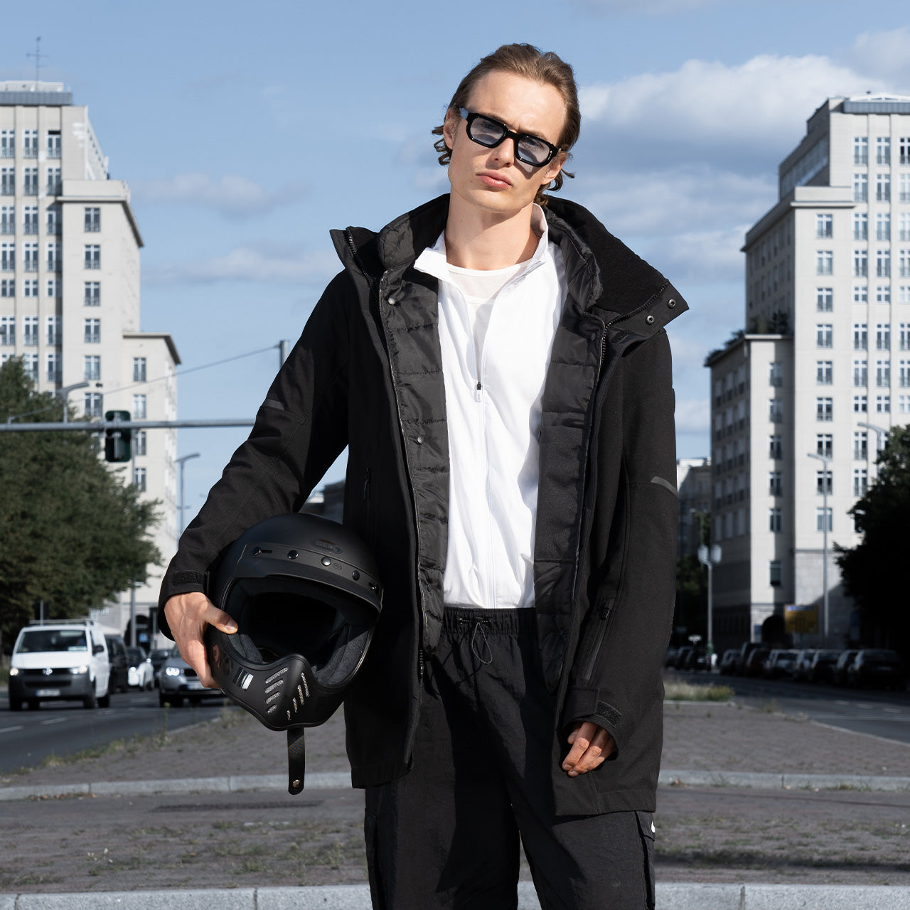 Les bandes réfléchissantes assurent une excellente visibilité panoramique, permettant au pilote d'être vu de toutes les directions. Pour plus délégance, ces bandes sont soudées au textile. Ce processus d'assemblage élimine aussi toute trace de coutures, pour plus de sécurité.