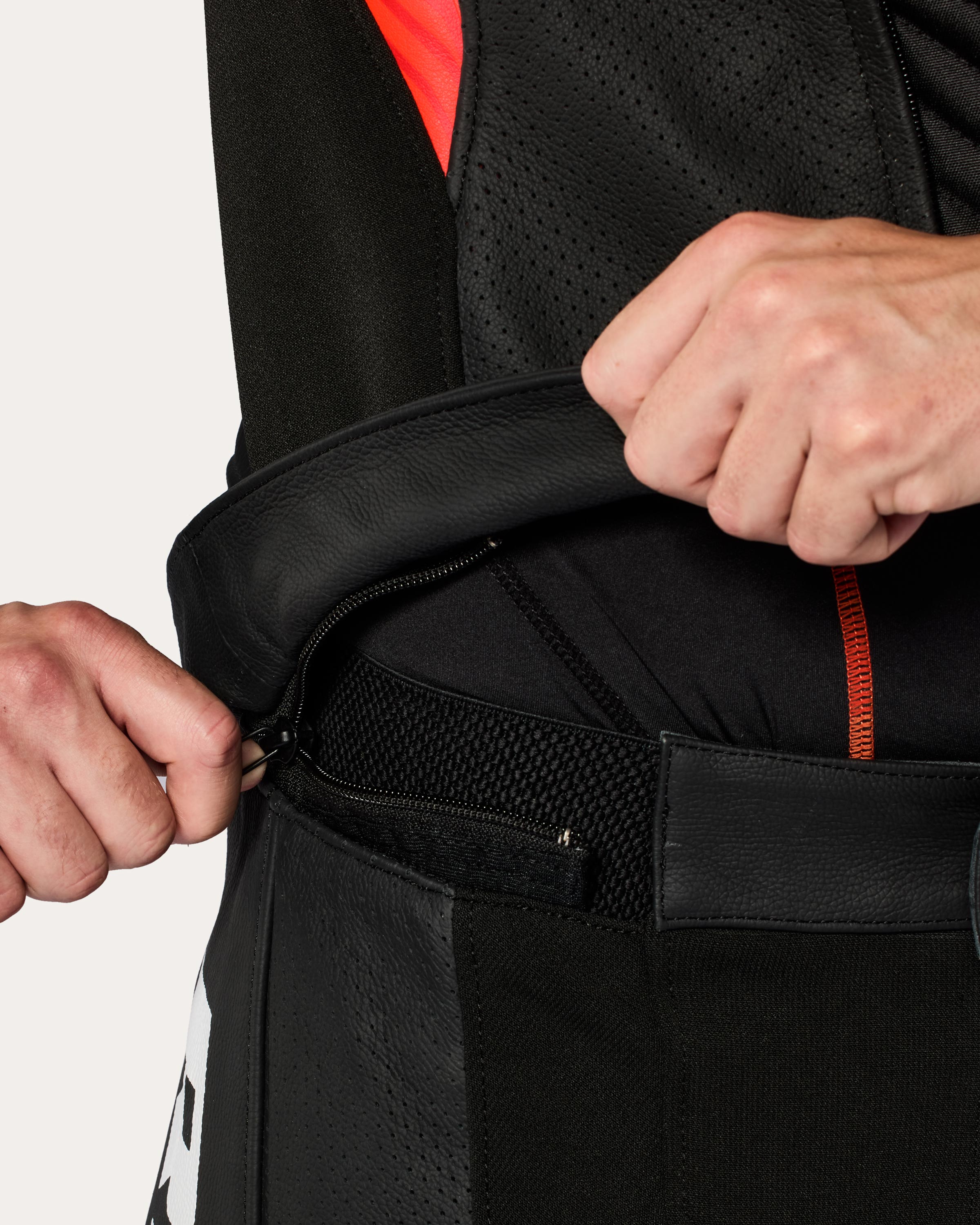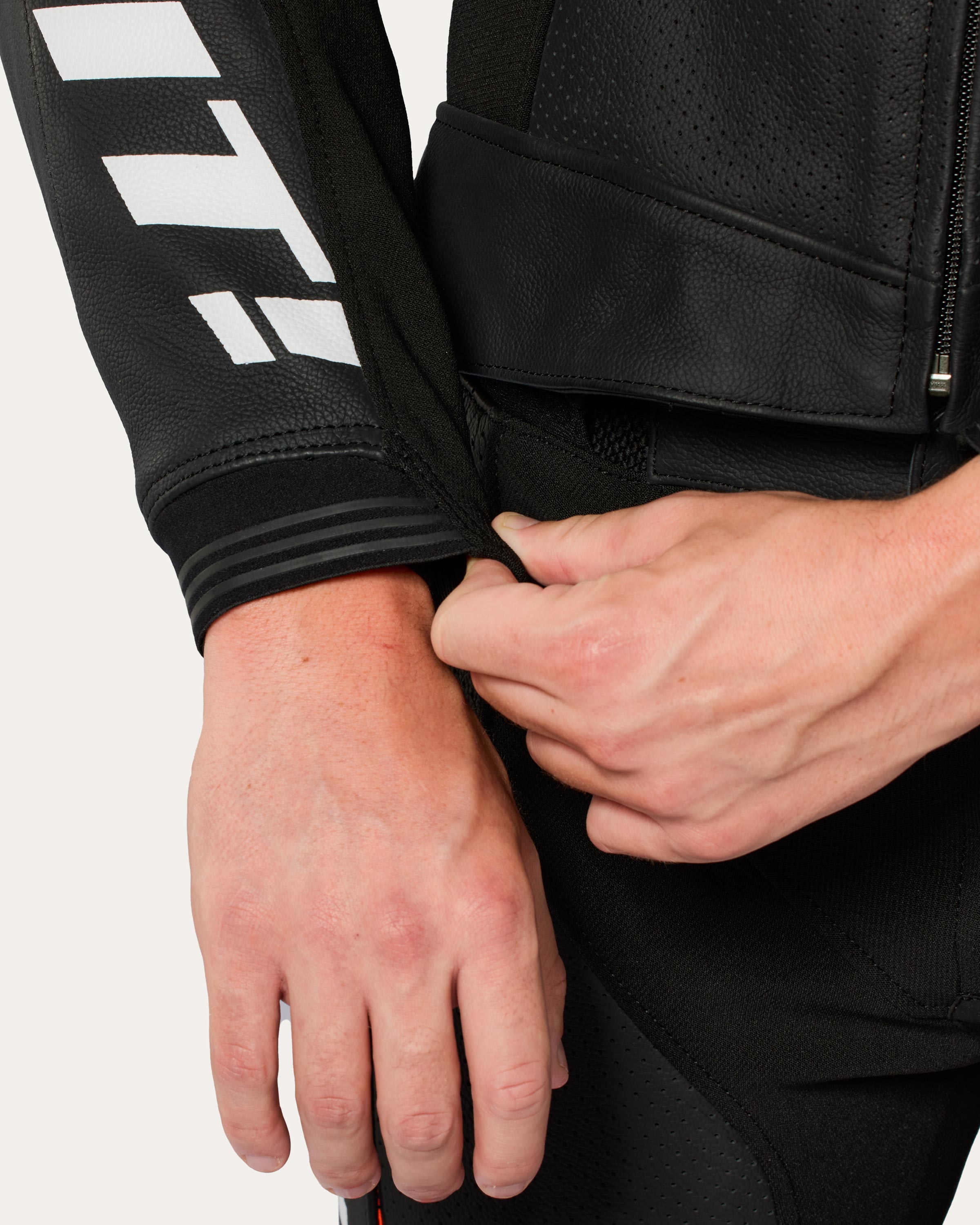 La possibilité de zipper et de dézipper le haut et le bas quand vous le souhaitez ouvre un large éventail de possibilités, le tout avec les éléments de performance adéquats, tels que le coussin de ralentissement et les mêmes pièces rigides de protection des extrémités que nous fournissons à nos pilotes de course. Et comme la conduite performante nécessite un refroidissement important, nous avons veillé à ce que l'ensemble de la combinaison soit équipé de panneaux en cuir perforé et de tissus en maille respirante pour laisser passer l'air frais.