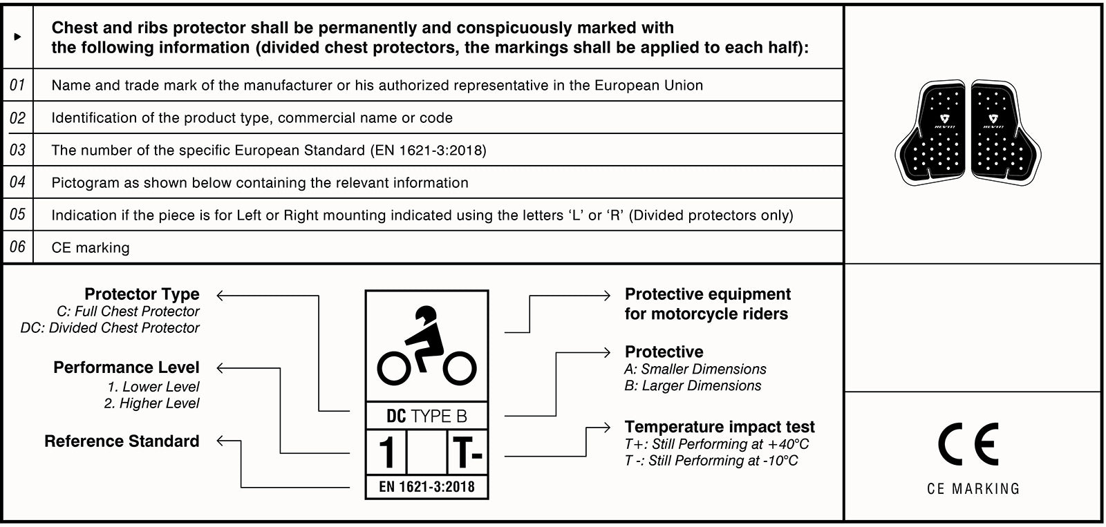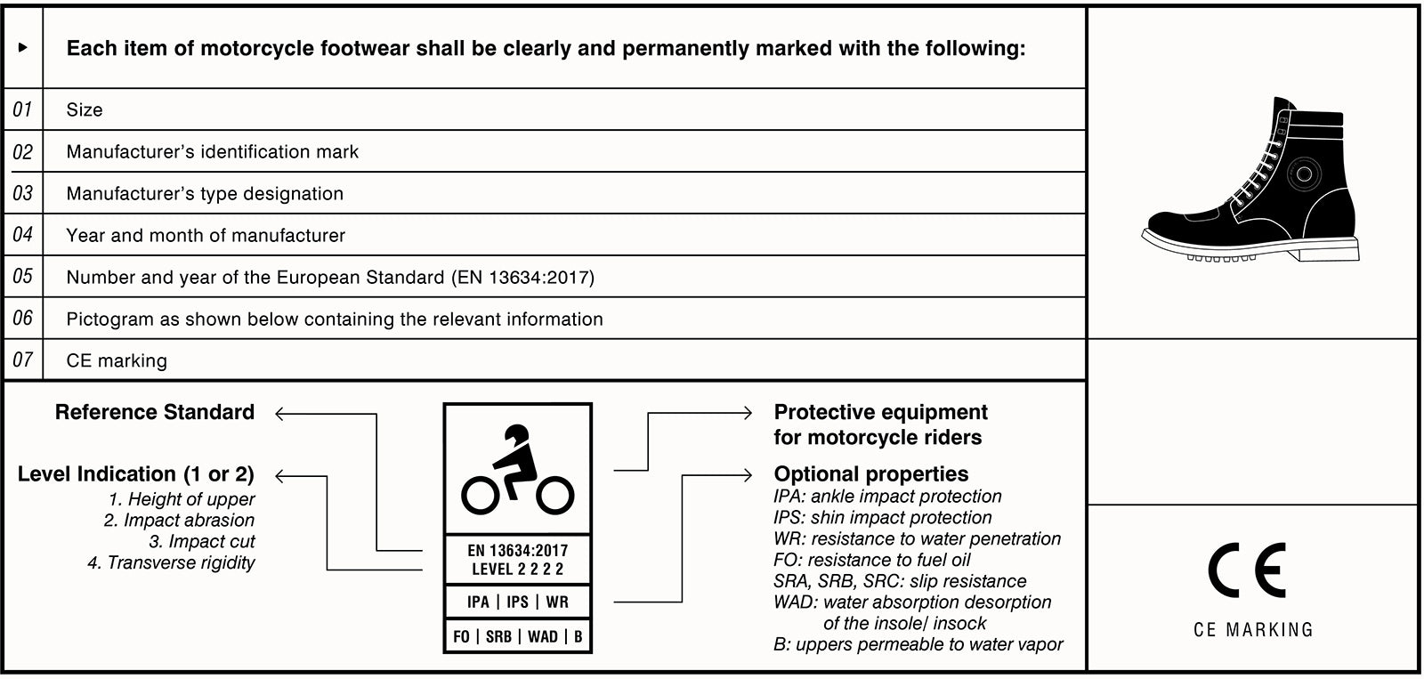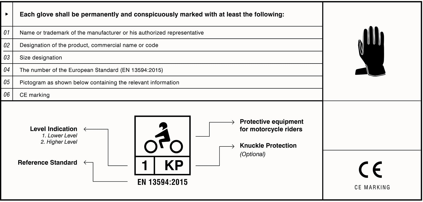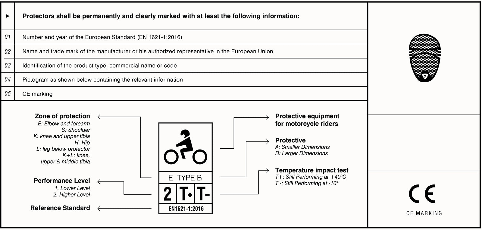Not everyone plays by the rules, and so it’s important to take notice of the following information when trying to figure out whether a garment, boot , protector, or pair of gloves is actually CE-compliant. Part of CE compliance is also correct labeling, and this is a relatively easy way to distinguish fake labeling from authentic labeling.