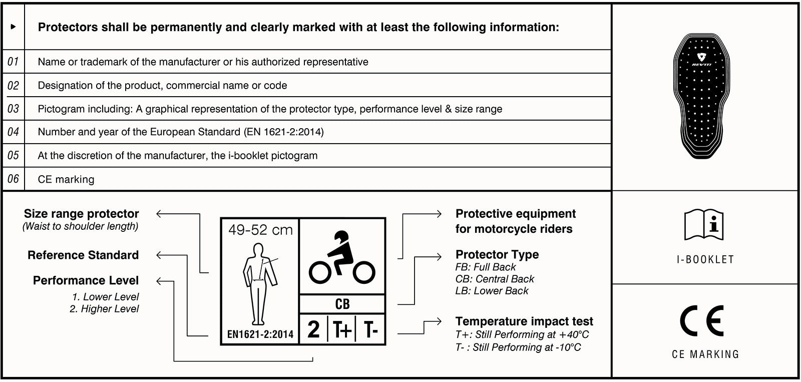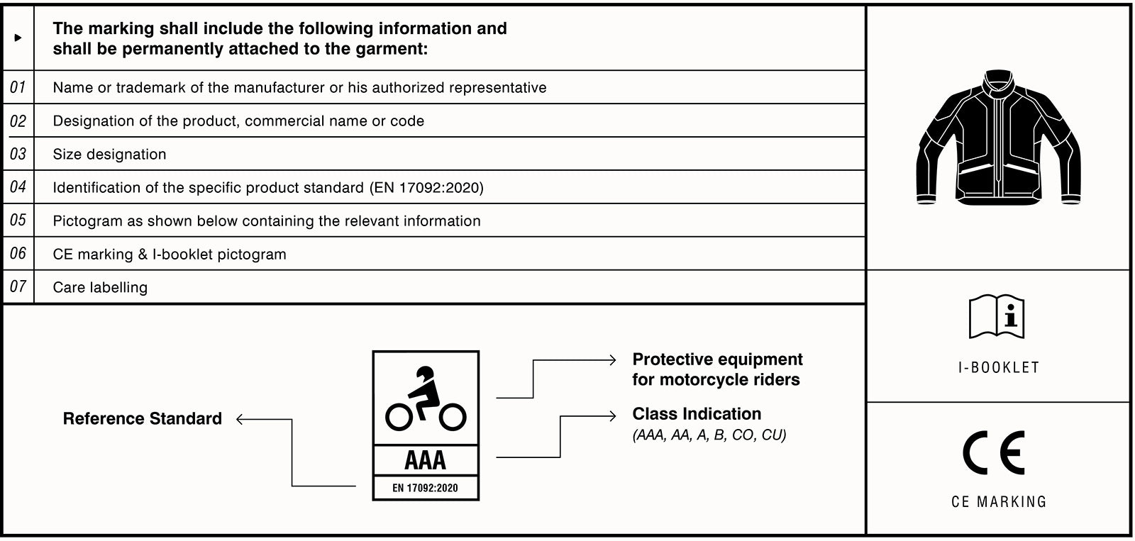 Every garment/protector/gloves/boots/shoes in the store (products launched to market after April 2018), which has been CE certified will always have a booklet explaining in which class it has been certified in. There will also be either markings or labels indicating which class of protection it provides and the standard against which it was tested. Care and maintenance instructions will also be provided, among others.