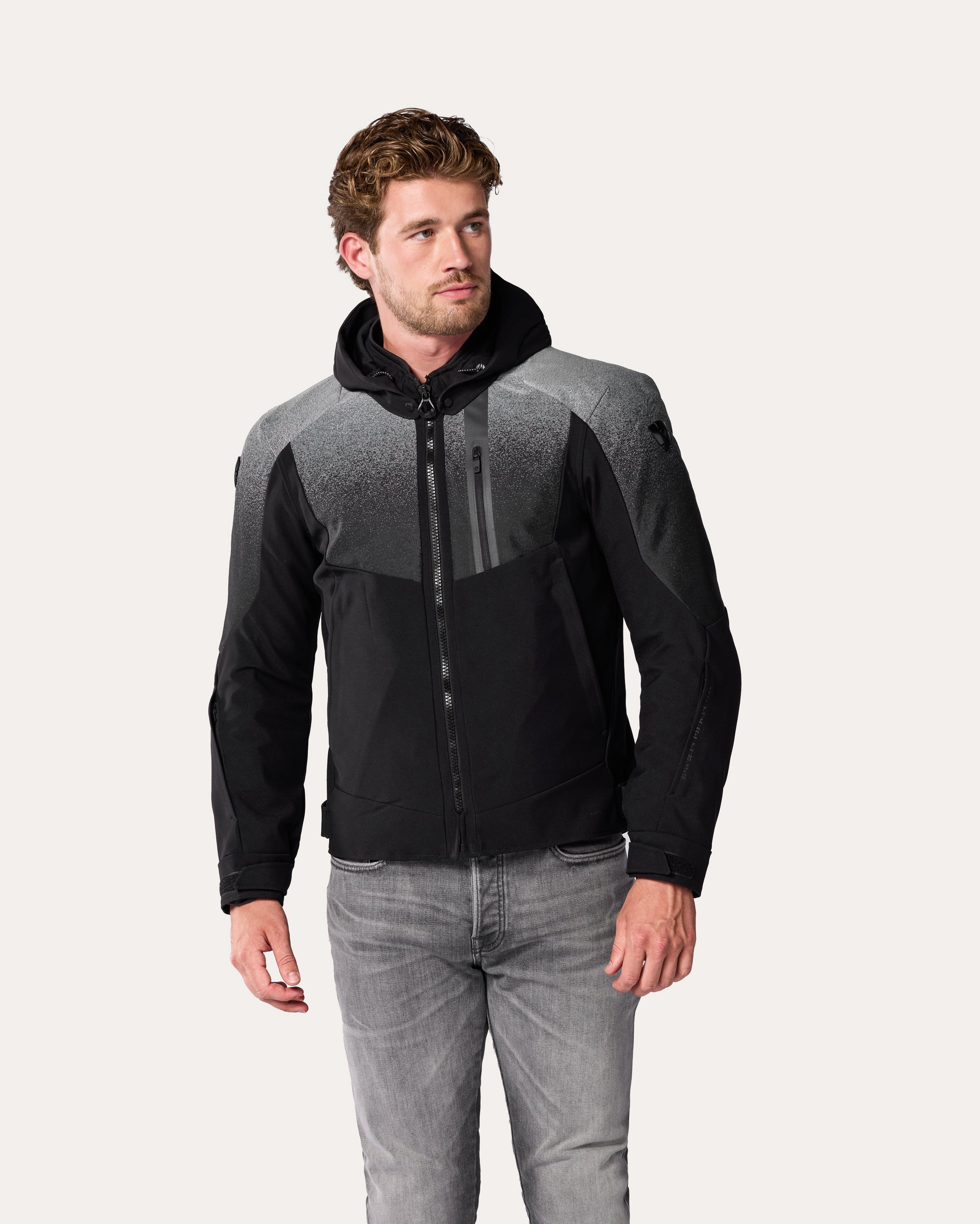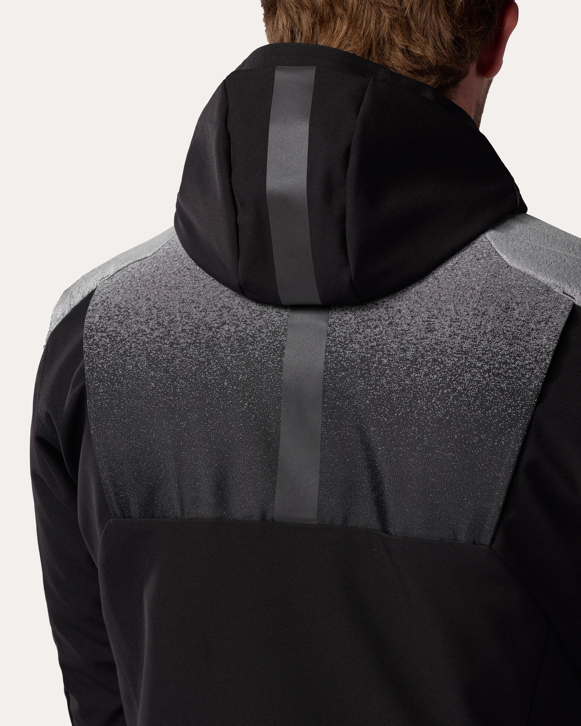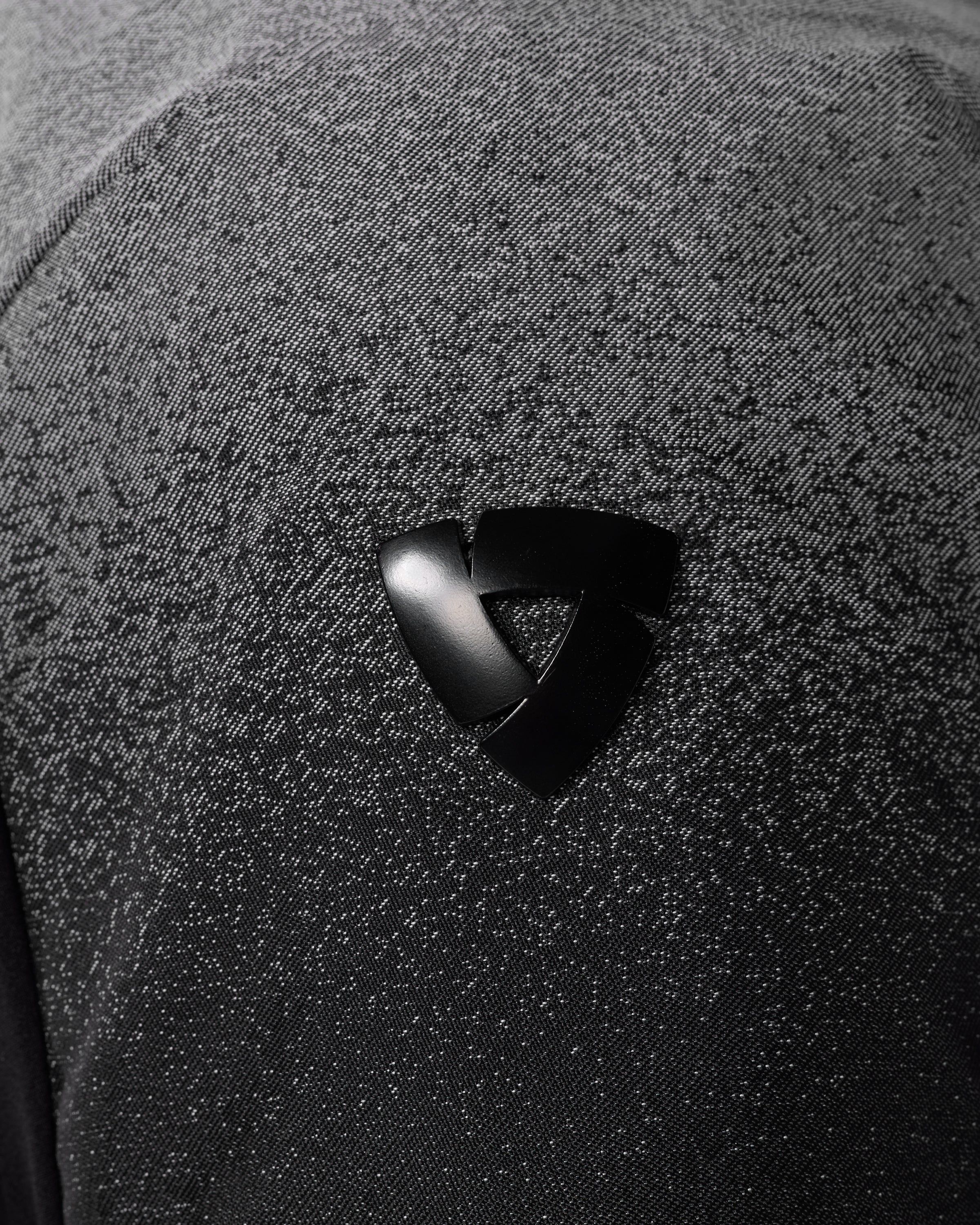 The upper region of the Epsilon H2O jacket is comprised of a jacquard woven fabric with an integrated gradient graphic. When we say integrated, the artwork is actually woven into the material itself, creating a beautiful visual effect that tapers seamlessly into the dark lower half. We also did something different with the hood – which is detachable. When affixed, the hood is held down by a magnetic fastener, which is then fused with laminated reflection. When the rider is wearing the hood, the lines of the lamination line up both on the hood and the jacket, creating a symmetrical vertical line.