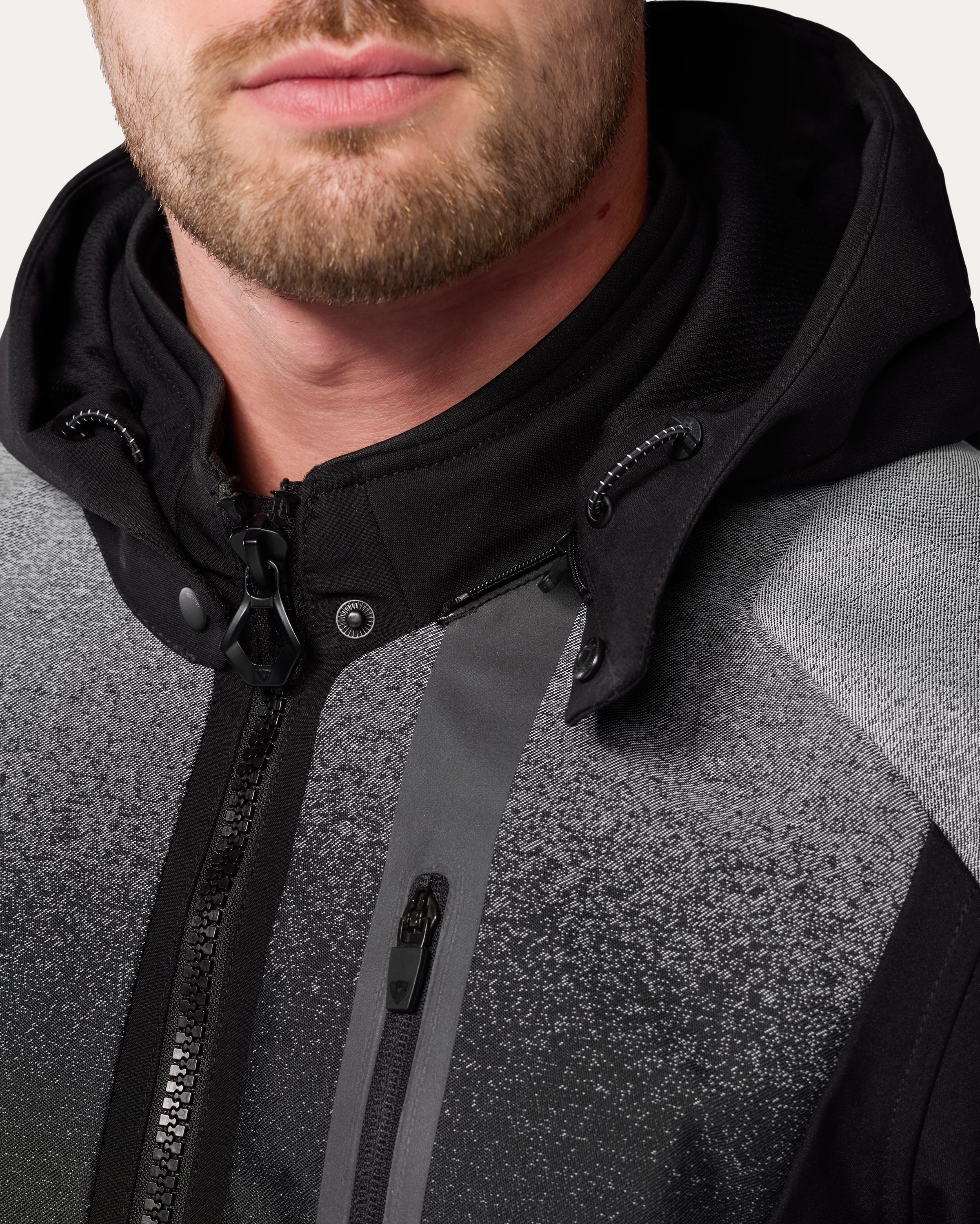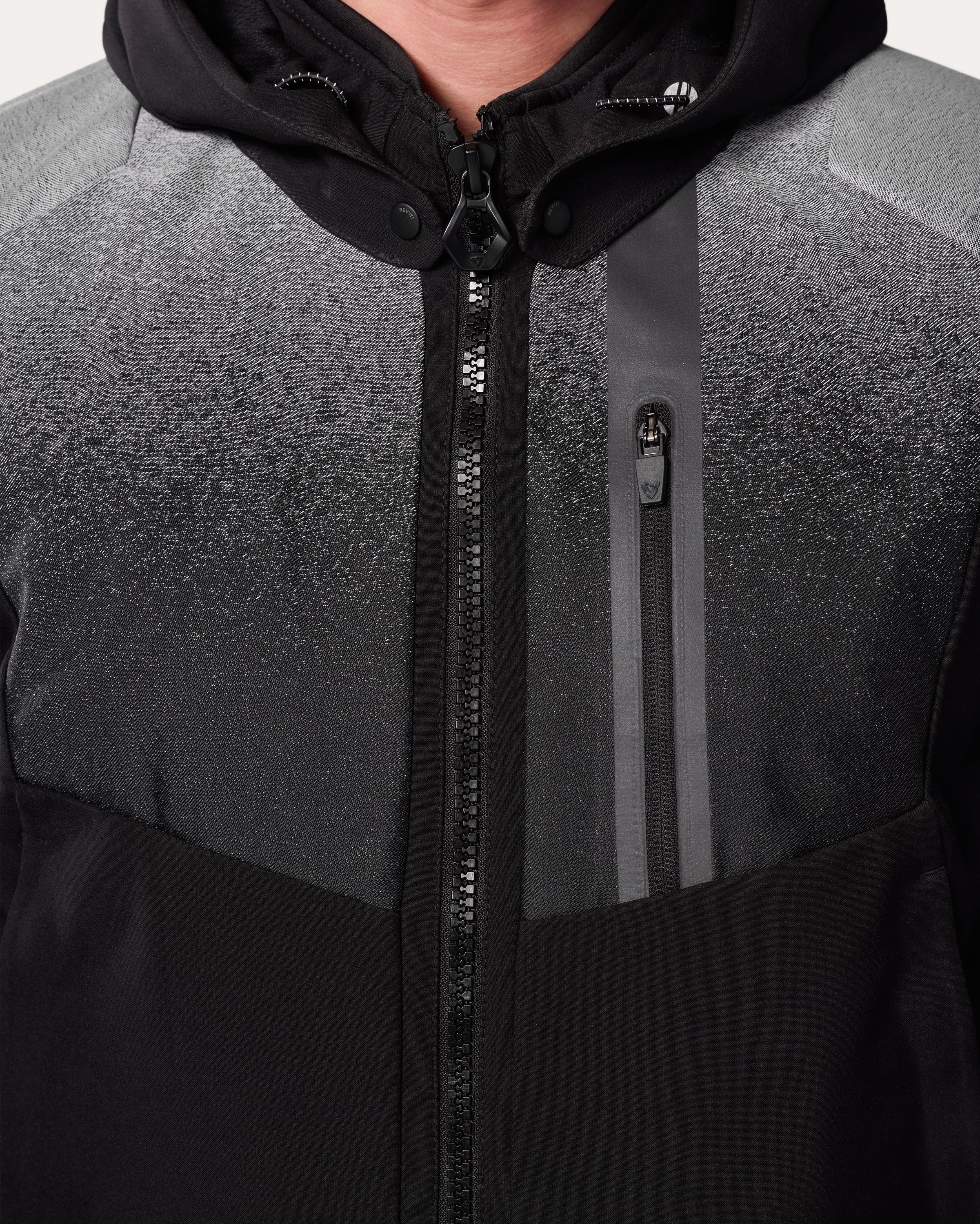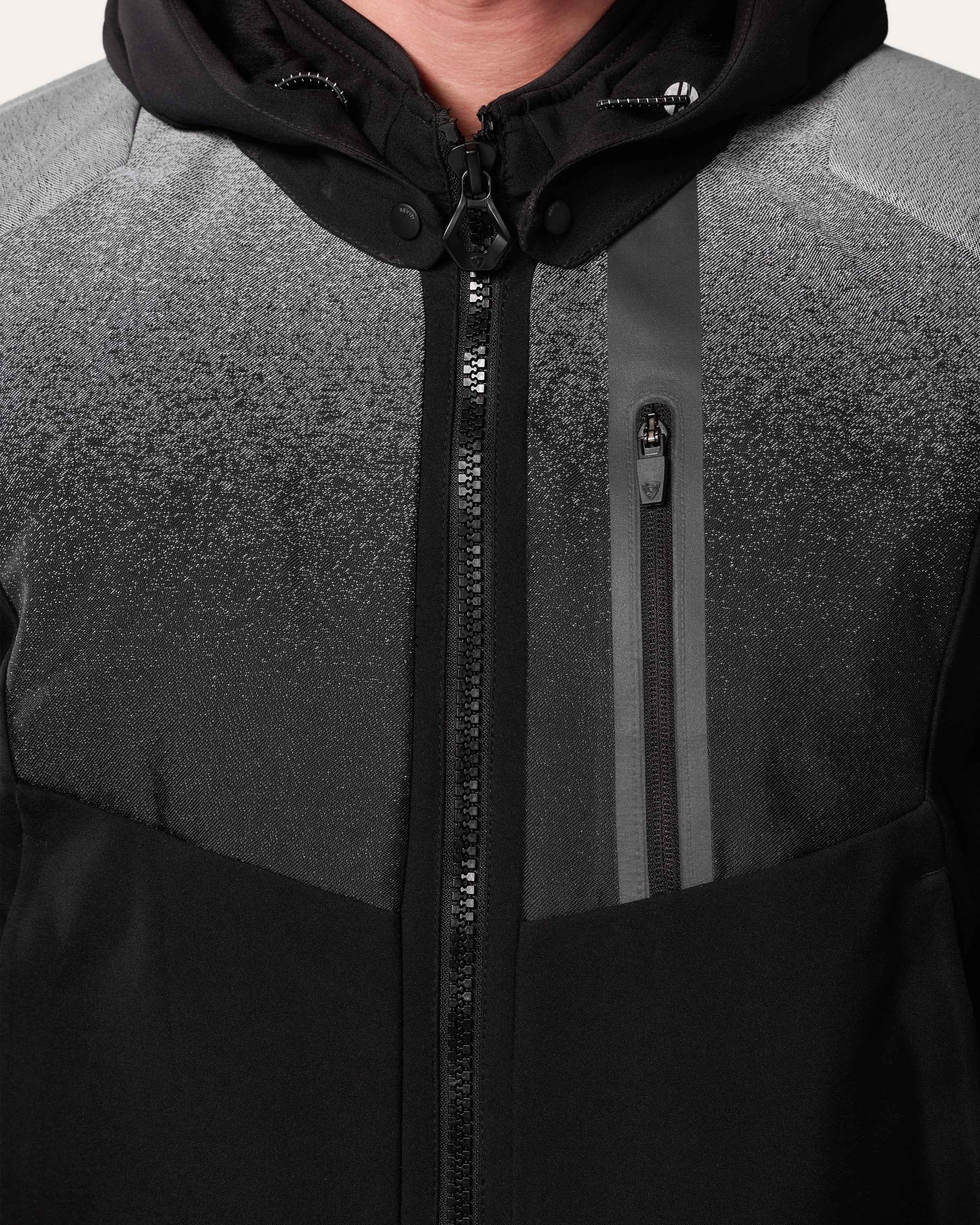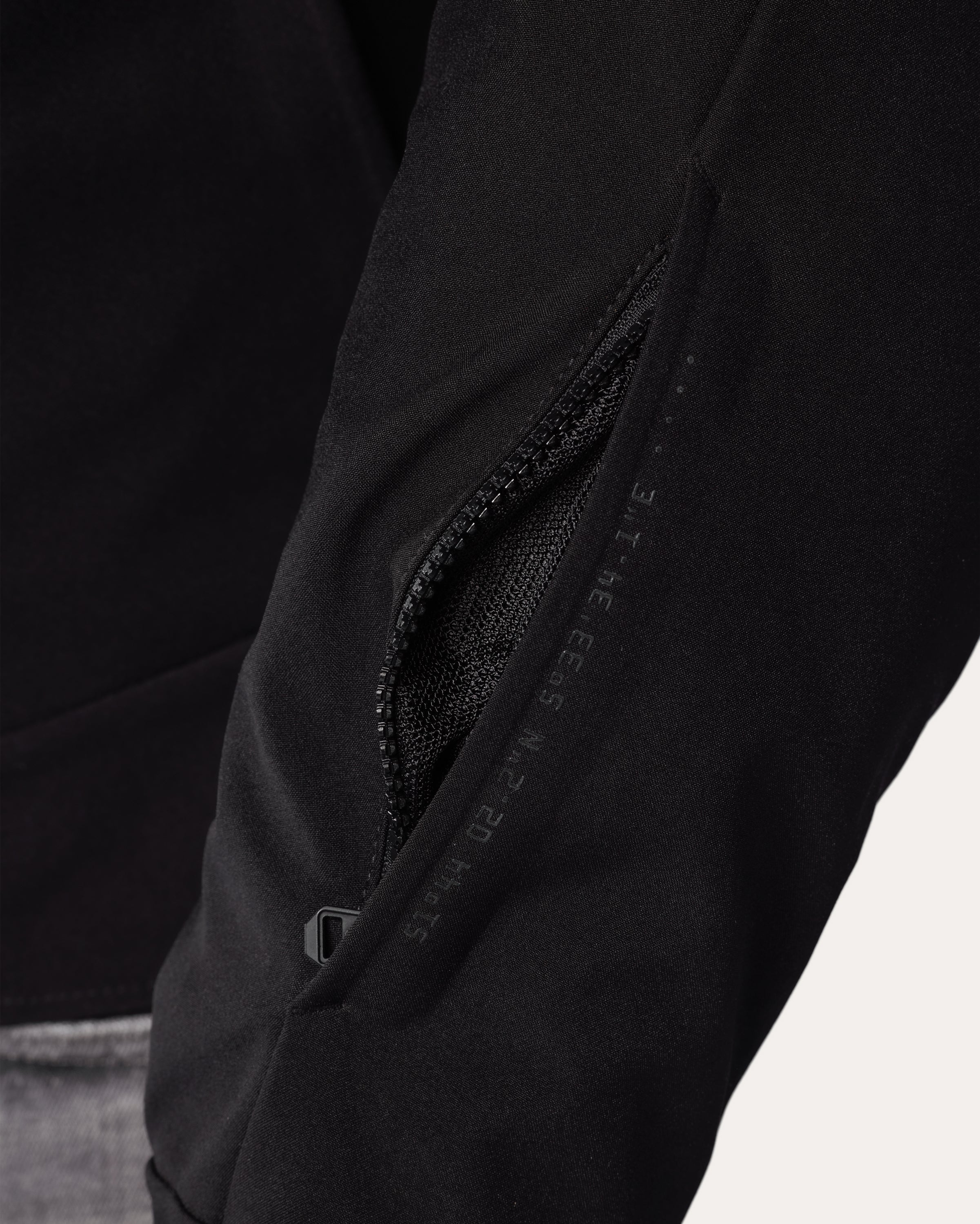 The upper region of the Epsilon H2O jacket is comprised of a jacquard woven fabric with an integrated gradient graphic. When we say integrated, the artwork is actually woven into the material itself, creating a beautiful visual effect that tapers seamlessly into the dark lower half. We also did something different with the hood – which is detachable. When affixed, the hood is held down by a magnetic fastener, which is then fused with laminated reflection. When the rider is wearing the hood, the lines of the lamination line up both on the hood and the jacket, creating a symmetrical vertical line.