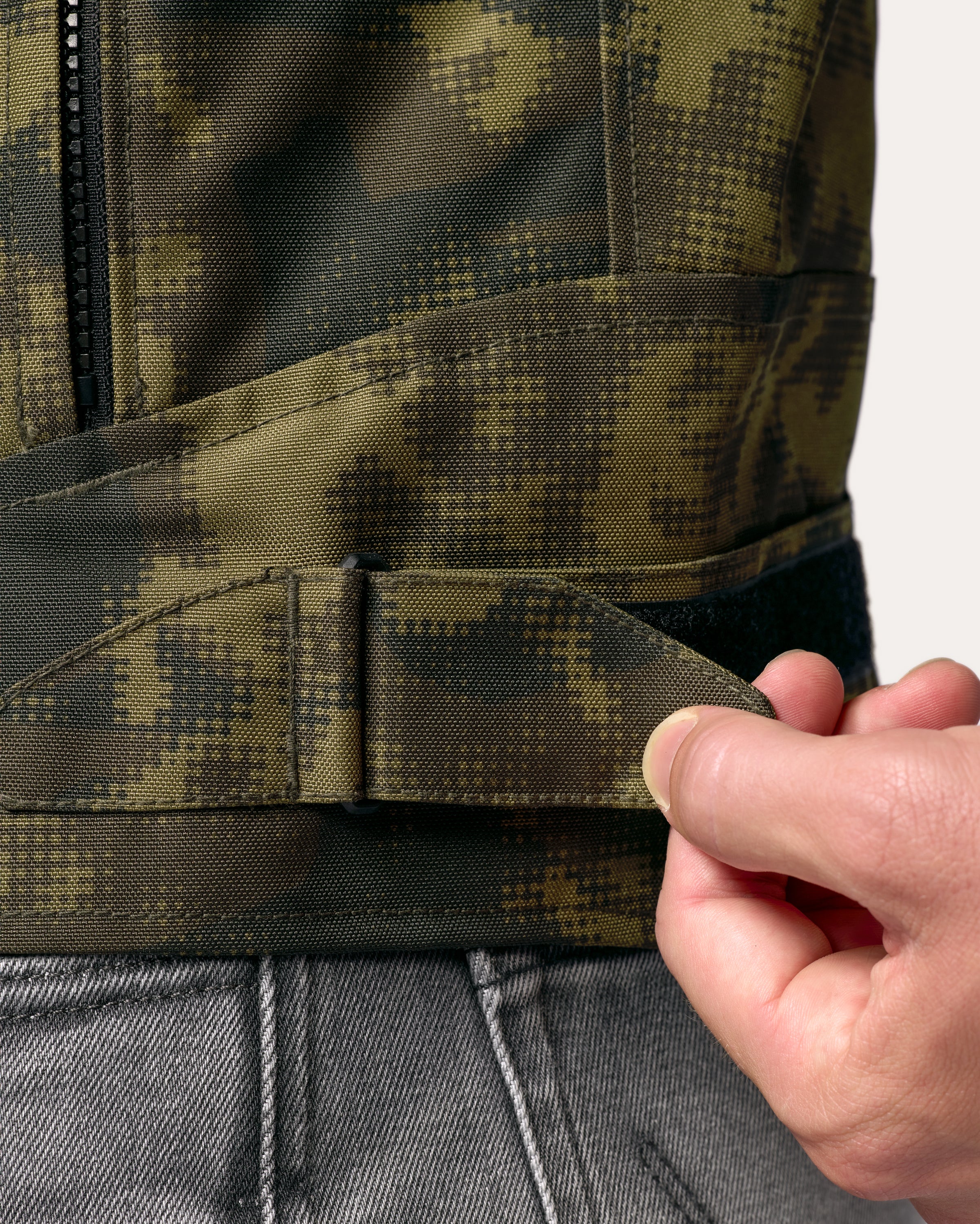 The loop at the back of this jacket enables you to attach it to your jeans, which prevents the jacket from creeping up: no more exposed back when riding your bike.