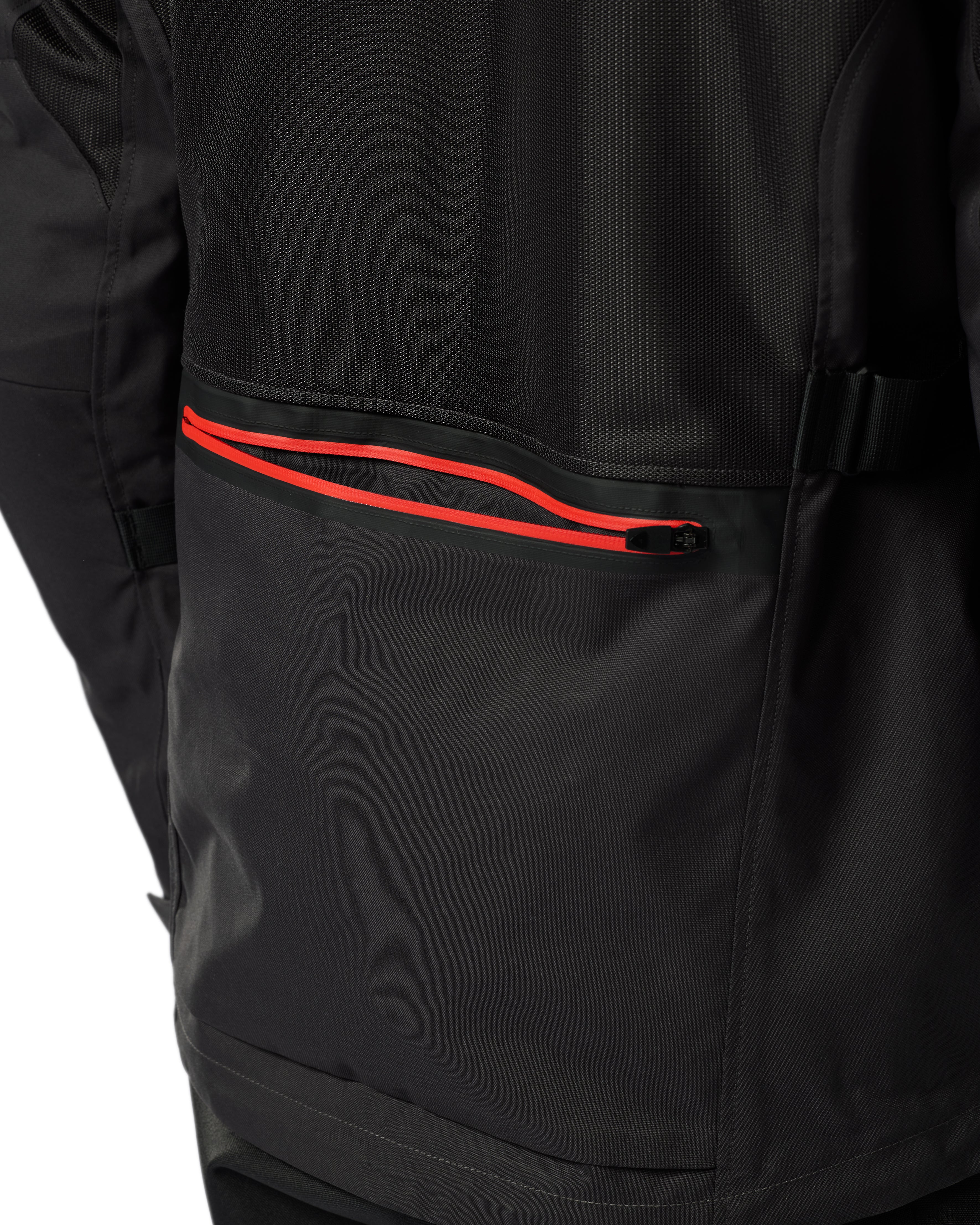 A slit pocket at the lower back allows for easily accessible storage of personals where it doesn't interfere with the rider.