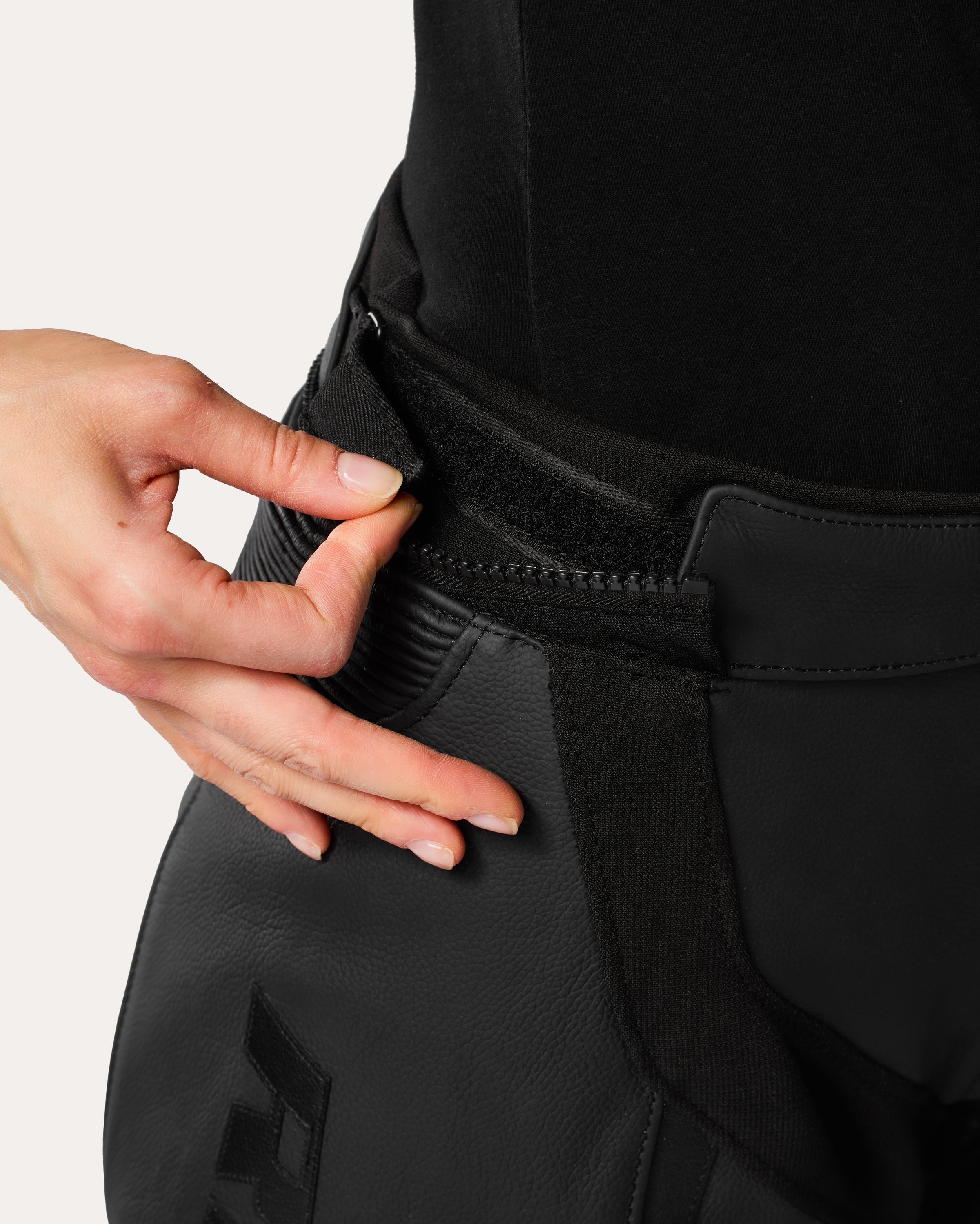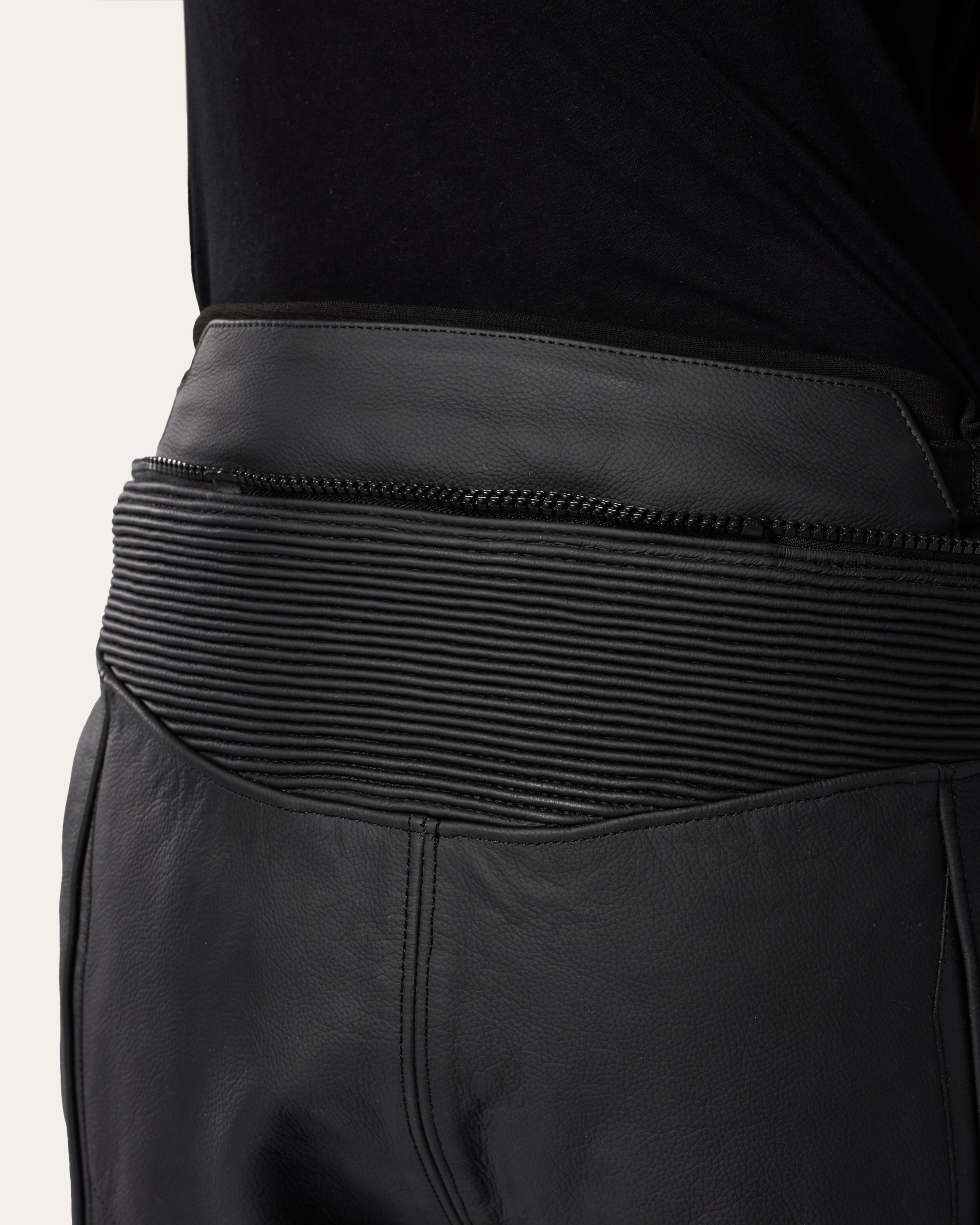 The short connection zipper is the shorter, simpler and quicker choice of our two connection zipper options. It lets you zip the motorcycle jacket and motorcycle pants together as one. For comfort and for safety.