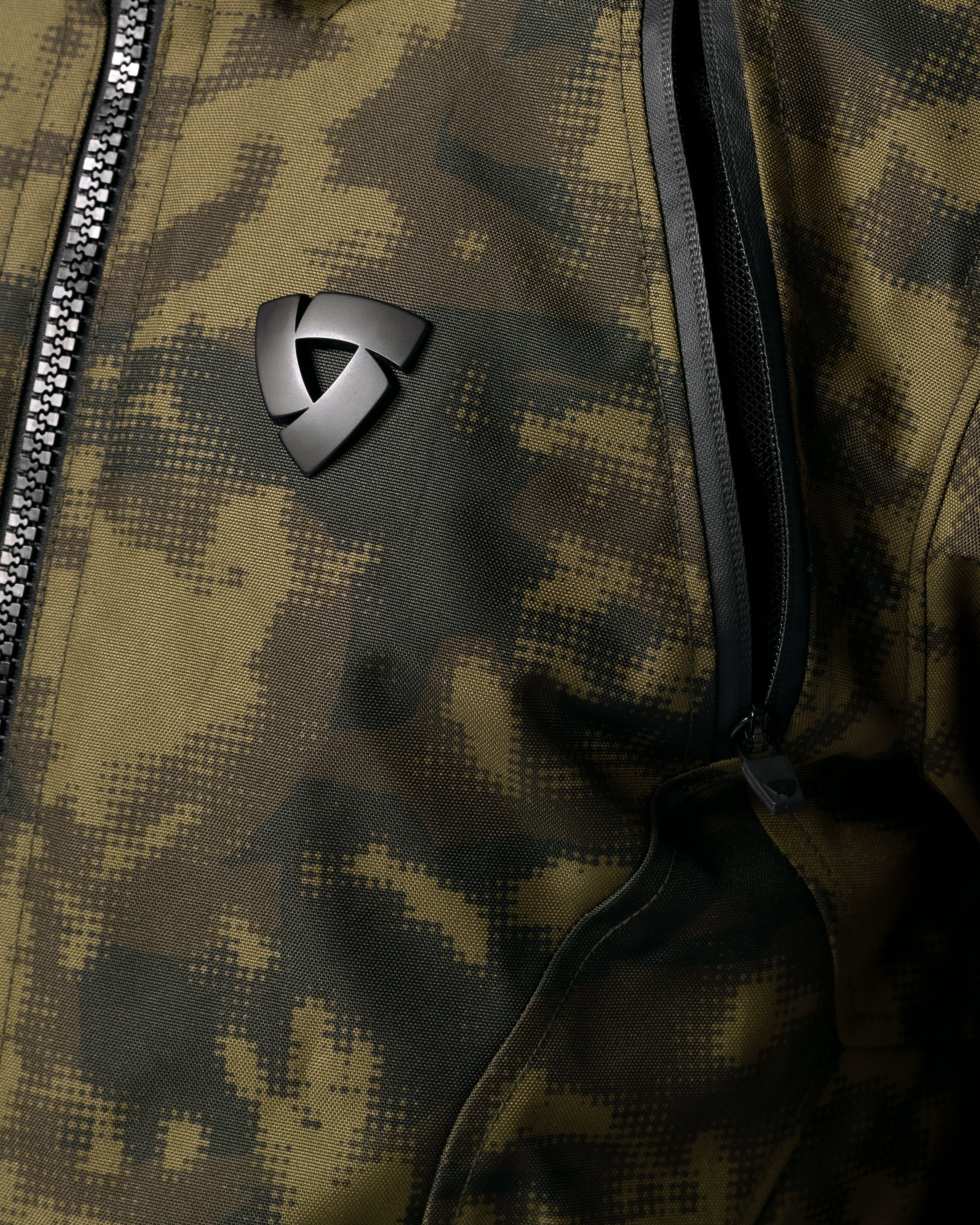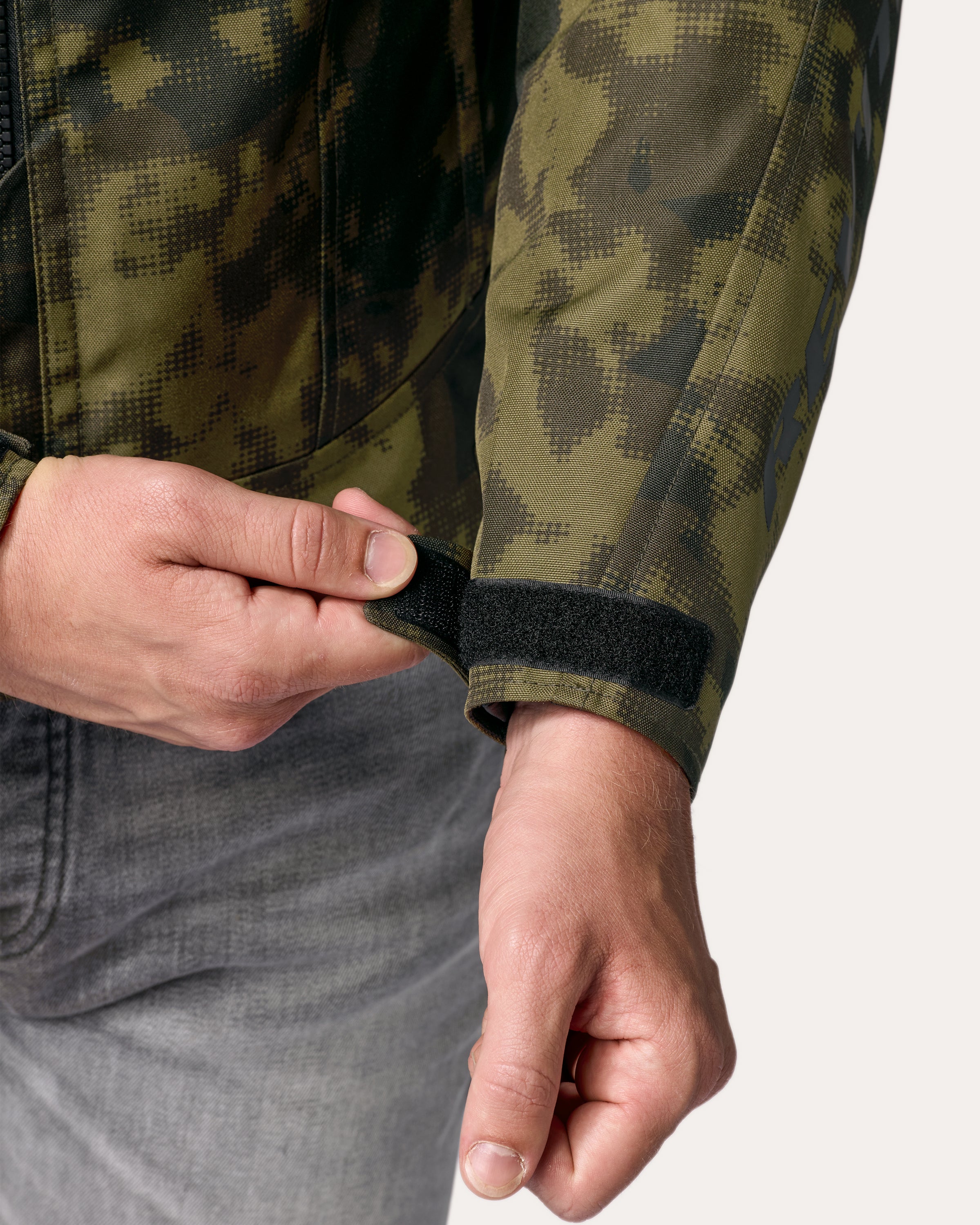 Schau dir die Linien der Flare 3 H2O Jacke an. Sieh dir das mal genauer an. Versteckt im Hintergrund eines modernisierten Camo-Prints haben wir beschichtete Belüftungsreißverschlüsse geschickt in die Designlinien vom Schlüsselbein entlang der Brust eingearbeitet. Die Verstelllasche entlang des Oberarms folgt ebenfalls dem Verlauf der Nähte und sorgt so für einen maßgeschneiderten Look. Klettverschlüsse an den Ärmeln und an der Taille sorgen dafür, dass du immer die perfekte Passform hast.