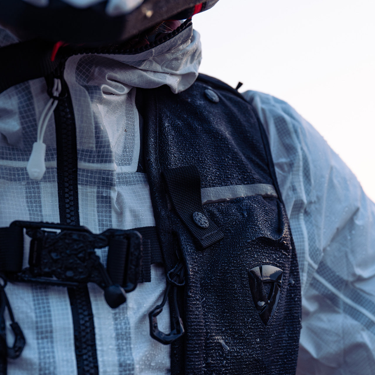 Wir haben die Trail-Weste mit zwei Brusttaschen ausgestattet, in denen jeweils ein 500 ml Hydra-Bag untergebracht werden kann, damit du auf deinen Abenteuern immer genug Flüssigkeit hast. Es gibt auch eine untere Rückentasche, die für den 1,5-Liter-Lenden-Hydra-Bag vorbereitet ist, um die Gewichtsverteilung gering zu halten. So kannst du das wasserdichte 7-Liter-Hauptfach mit zusätzlichen Schichten, Regenkleidung, Essen oder was auch immer du mitnehmen möchtest, füllen. Das Trinkrohr des Hydra-Bags wird dann in die Weste eingeführt, damit es nicht auf deine Kleidung ausläuft und sich während der Fahrt nicht verfangen kann. Um dem Sicherheitsaspekt Rechnung zu tragen, haben wir Schultertaschen für den Garmin® InReach® Mini angebracht.