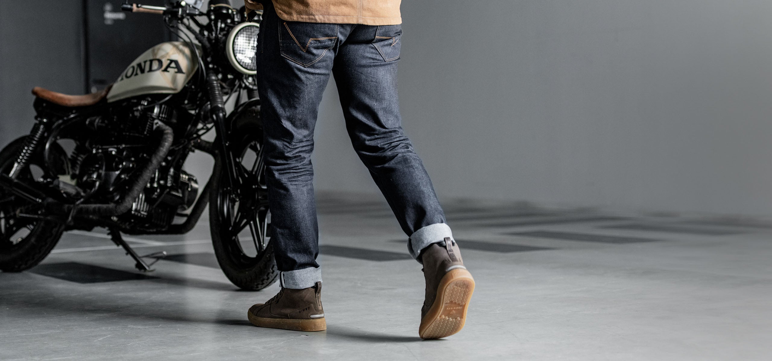Preparados para la carretera con estilo y confort. Eso está asegurado con todos nuestros vaqueros de estilo tapered. Y con los Salt TF en su variante de color azul usado, y los Detroit 2 TF con sus particulares elementos de moda elásticos. ¿Y qué tal nuestros Davis TF, de inspiración “worker”, o esos Moto 2 TF ennegrecidos, enfocados en lo deportivo?