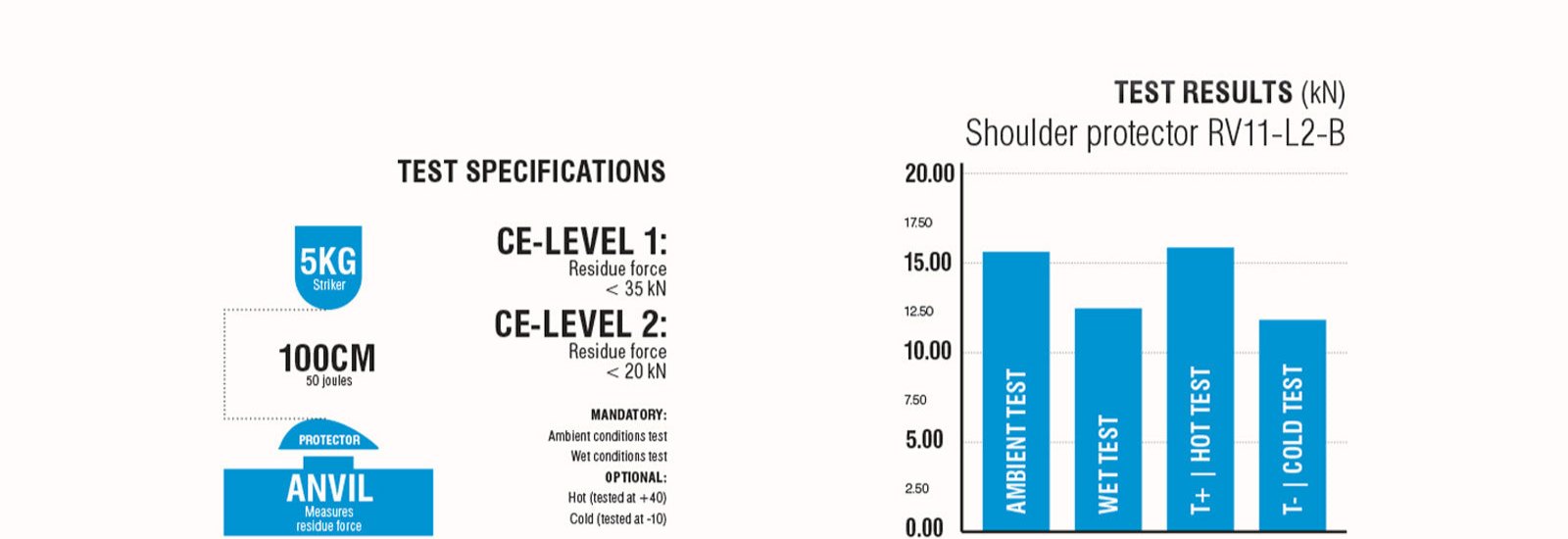 Para poder recibir la certificación CE, los protectores deben pasar el Test de Transmisión de Energía. Se mide la cantidad de fuerza que se permite pasar a través del protector después del impacto. En todos los test, el protector se coloca sobre un yunque y luego se deja caer otra pieza de 5 kilos, que está inicialmente 1 metro por encima. Para asegurar que por lo menos la energía cinética del impacto sea de 50J. El objetivo principal de un protector es evitar que la energía lo traspase; por tanto, como menor sea el valor de la energía transmitida, mejor será la capacidad de absorción del protector.