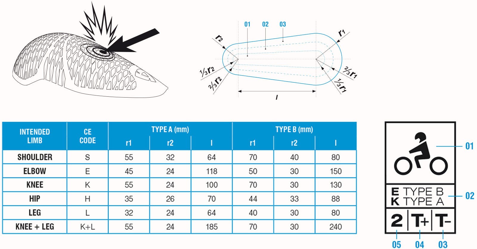 01 » Equipamiento protector para pilotos de motocicleta // 02 » Extremidad (codo/rodilla) y tipo (a/b) // 03 » Superado el test de impacto a baja temperatura** // 04 » Superado el test de impacto a alta temperatura** 05 » Nivel de rendimiento // ** 03 y 04 son test opcionales: si este espacio queda vacante, es porque el test no se ha realizado.