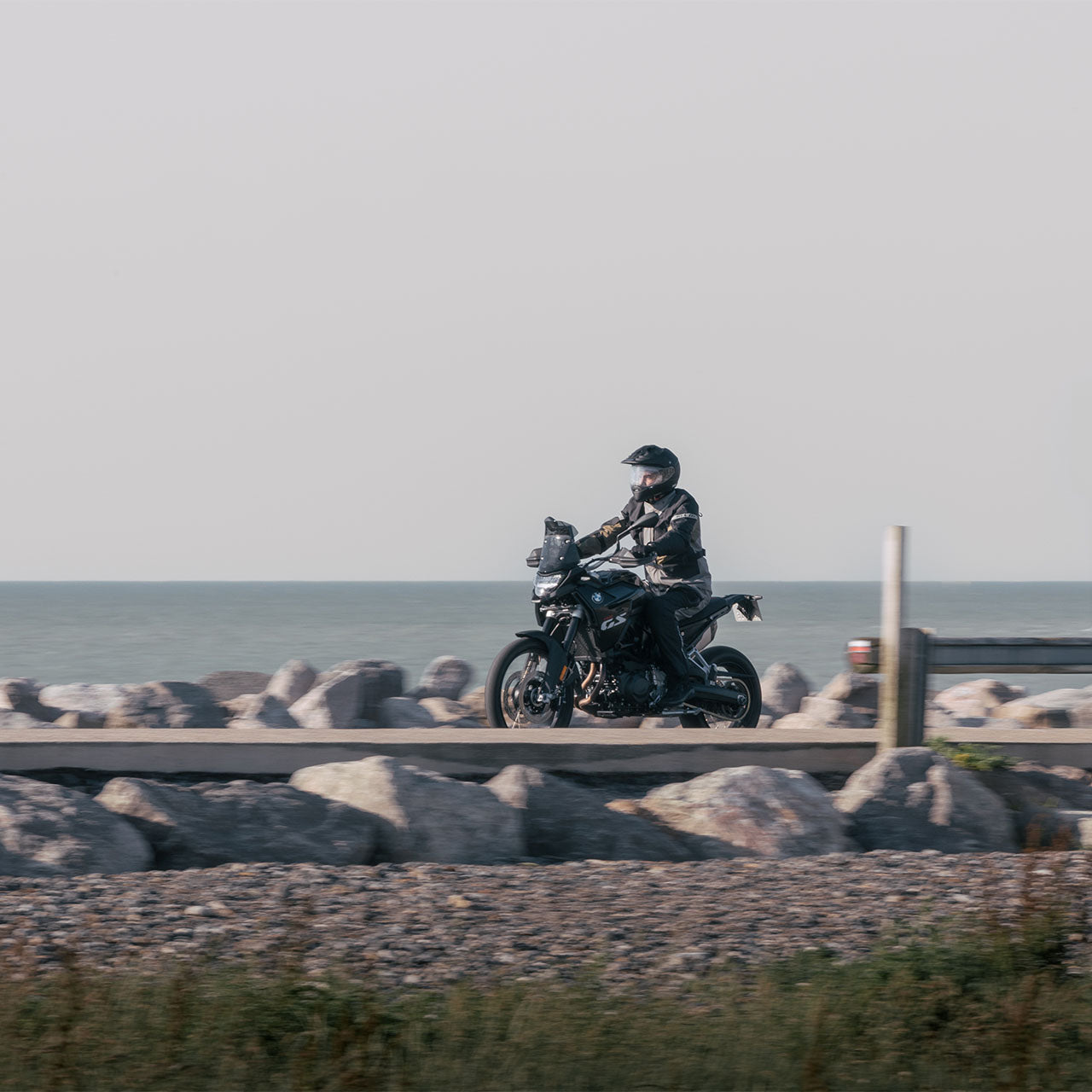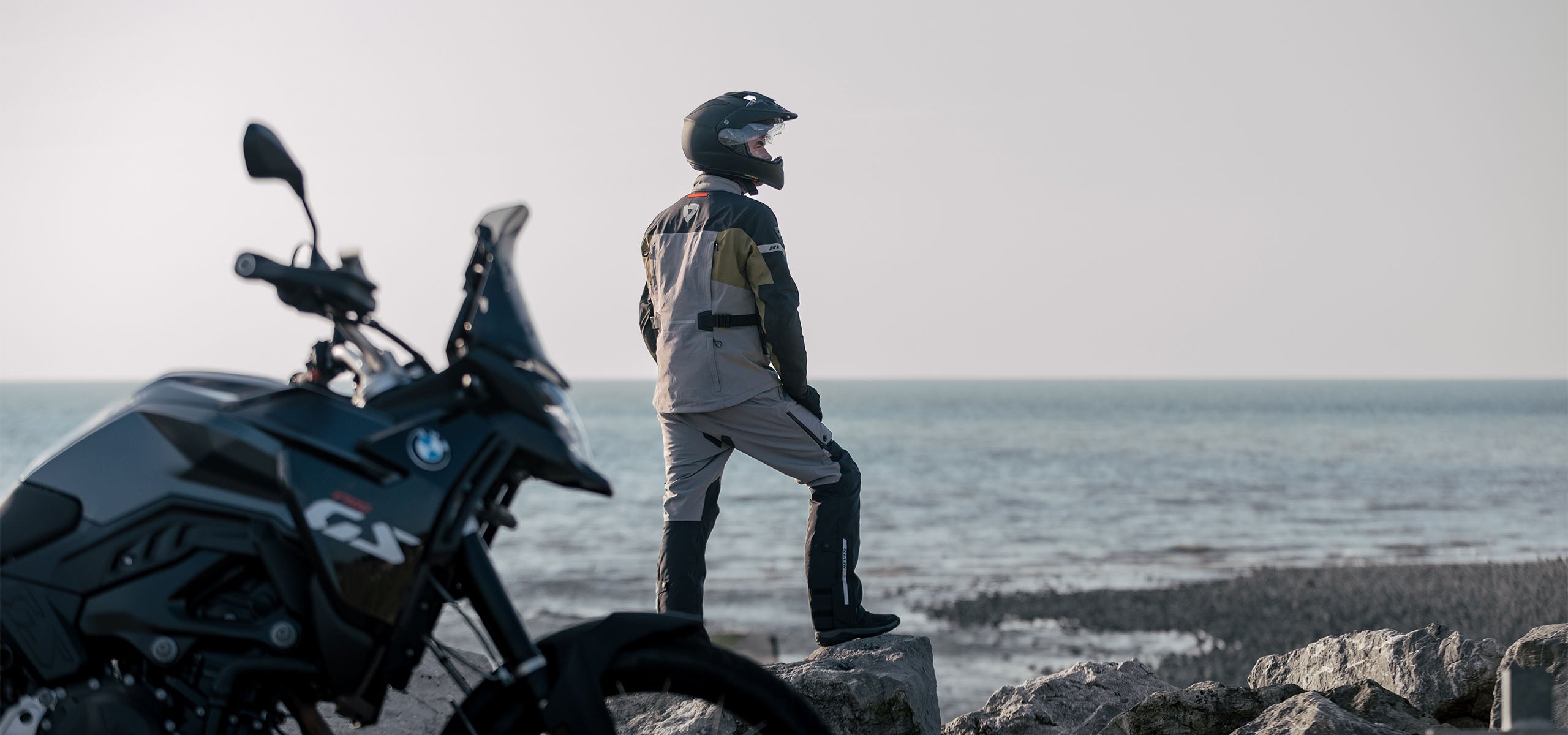 Si la veste Neptune 3 GTX a pour seul objectif de garder les motards au sec et en sécurité, cela ne veut pas dire que nous n'avons pas pu y ajouter quelques touches de finition élégantes. Par exemple, le design Hypalon à l'avant et à l'arrière, là où se trouvent les ajustements de la ceinture, donne à la Neptune 3 GTX une sensation encore plus haut de gamme, et la sangle de suspension robuste à l'arrière lui donne une belle touche de couleur par rapport à une palette de couleurs neutres. En ce qui concerne ses caractéristiques fonctionnelles, deux grandes poches à rabat imperméables se trouvent à l'avant, dotées d'une fermeture magnétique, pour accéder aux petites affaires que tu portes sur toi. Une poche fendue se trouve également dans le dos. De plus, une pochette zippée pour carte située sur la manche gauche évite de devoir fouiller dans ton sac ou sac à dos pour en sortir ton moyen de paiement.